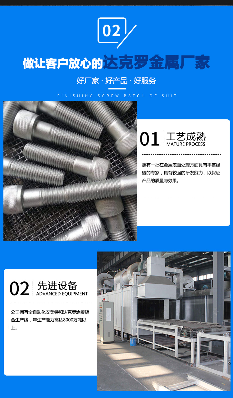 2.無氫脆性:達克羅的處理工藝決定了達克羅沒有氫脆現象,所以達克羅非常適合受力件的涂覆。